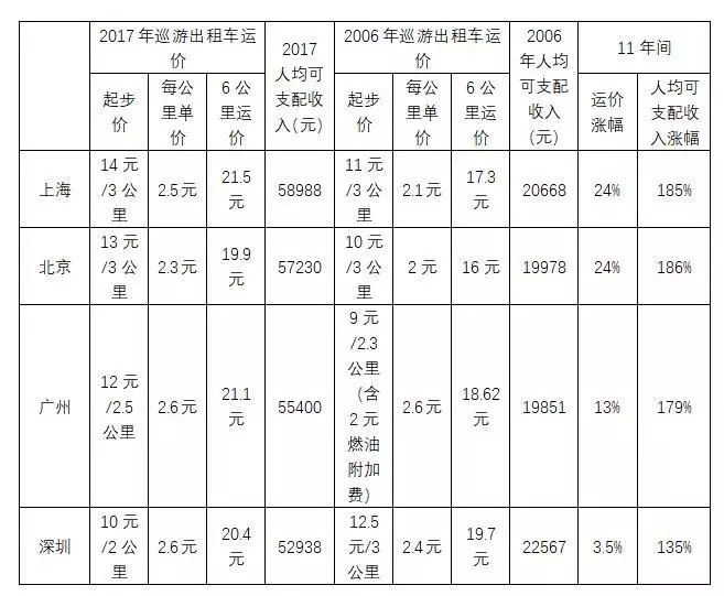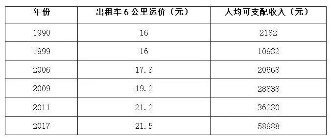 而同期上海市的人均可支配收入已从2182元(1990年)猛增到58988元(2017年),涨幅近26倍。出租汽车运价的涨幅远远落后于人均收入的增长。